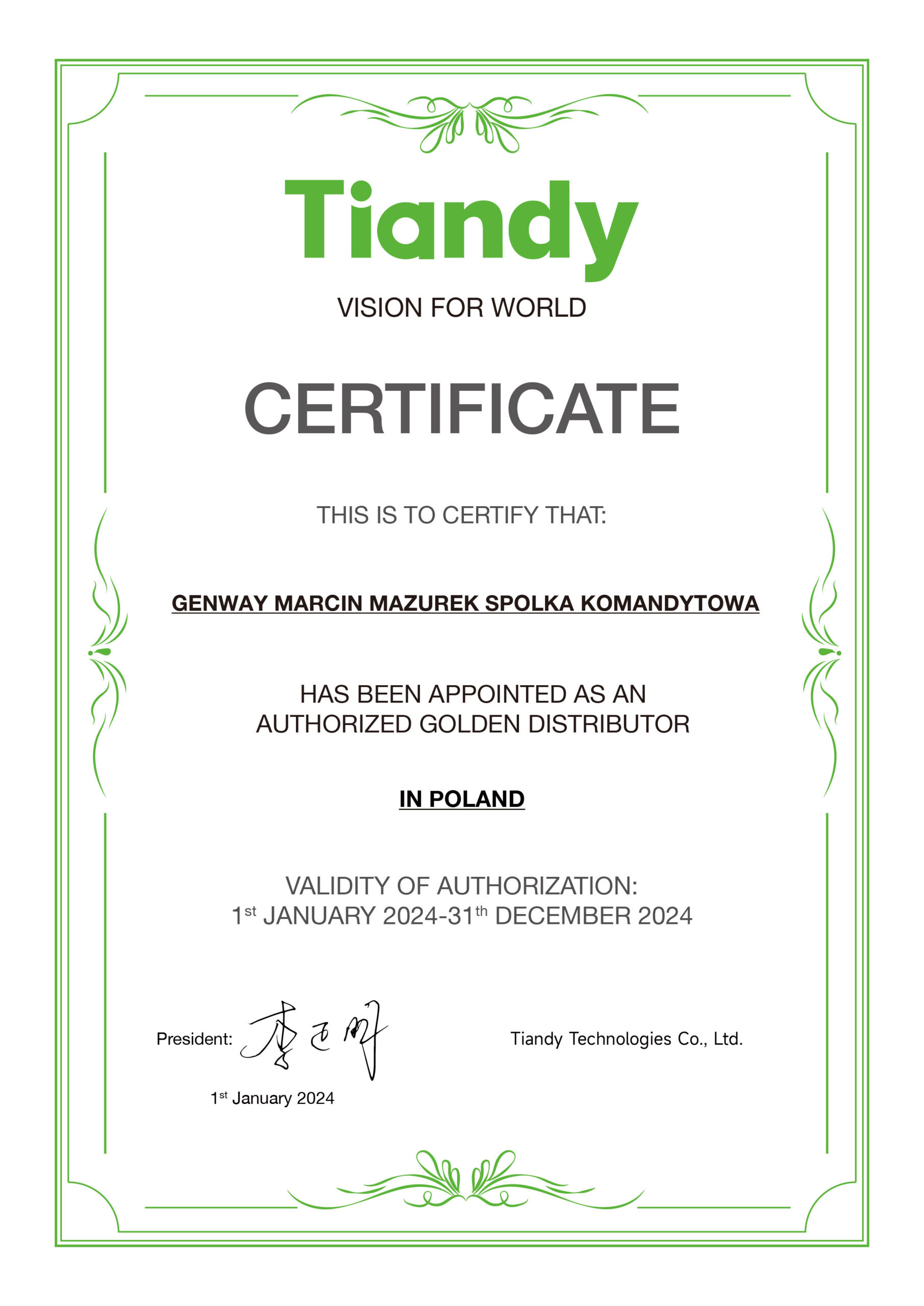 Założona w 1994 roku Tianjin Tiandy Digital Technology Co., Ltd. jest firmą, która dostarcza sprawdzone rozwiązania z zakresu systemów CCTV. Jej działania od 2012 roku skupiają się wyłącznie na systemach IP. Obecnie nad rozwojem tych produktów pracuje 1000 wysokiej klasy inżynierów R&D, a cała firma zatrudnia ponad 2500 pracowników. Dystrybucja urządzeń prowadzona jest w ponad 60 krajach na całym świecie. Od kilku lat firma Tiandy utrzymuje się w TOP10 rankingu Security 50. Jest producentem kamer i rejestratorów pod marką Vidiline.