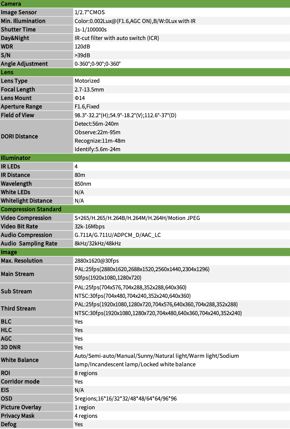 -Min. kolor podświetlenia: 0.002Lux@F1.6 - -Inteligentna podczerwień, zasięg podczerwieni: 80 m